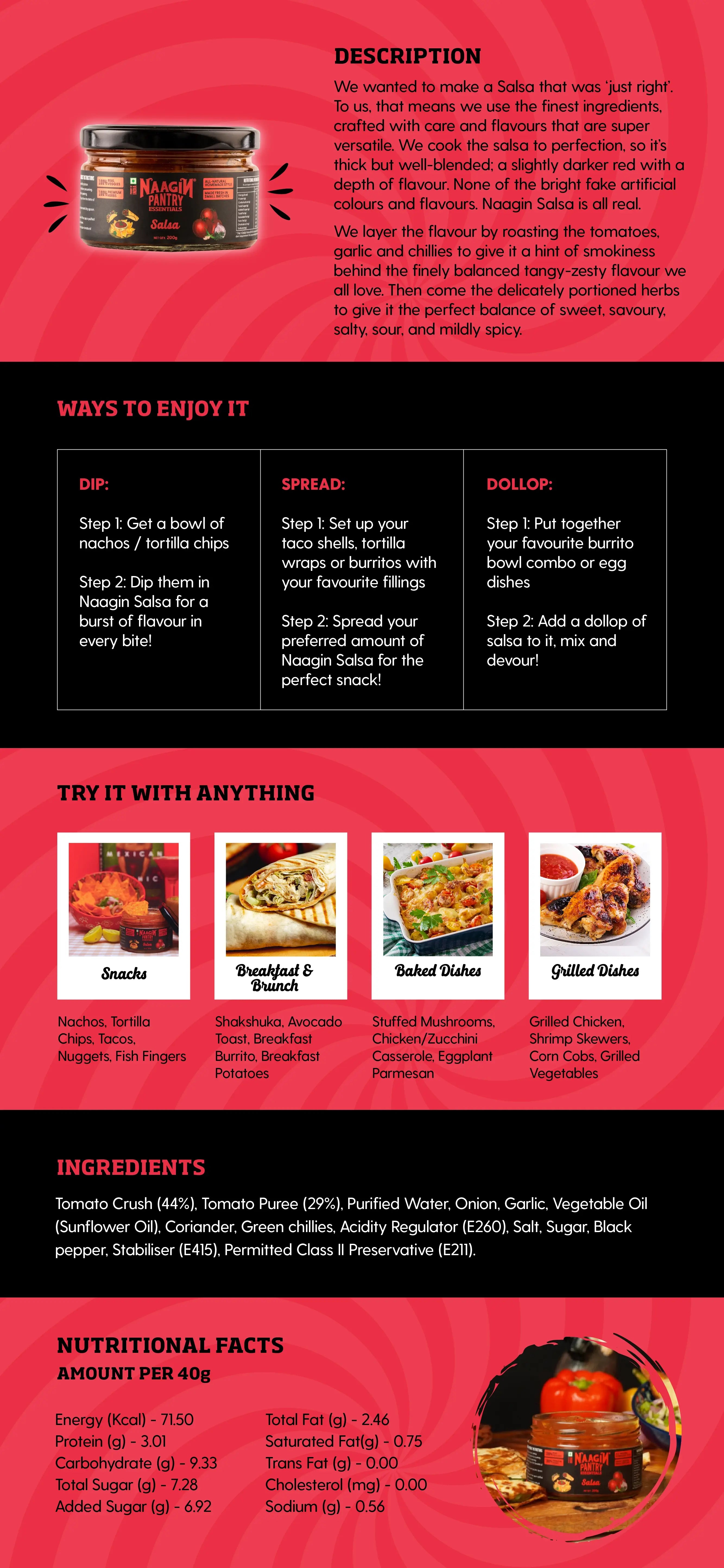 We wanted to make a Salsa that was ‘just right’. Tangy, zesty and perfectly seasoned - Our salsa is a tantalizing blend of flavours you’ll absolutely love. We layer the flavour by roasting the tomatoes, garlic and chillies to give it a hint of smokiness behind the finely balanced tangy-zesty flavour we all love. Then come the delicately portioned herbs to give it the perfect balance of sweet, savoury, salty, sour, and mildly spicy.
