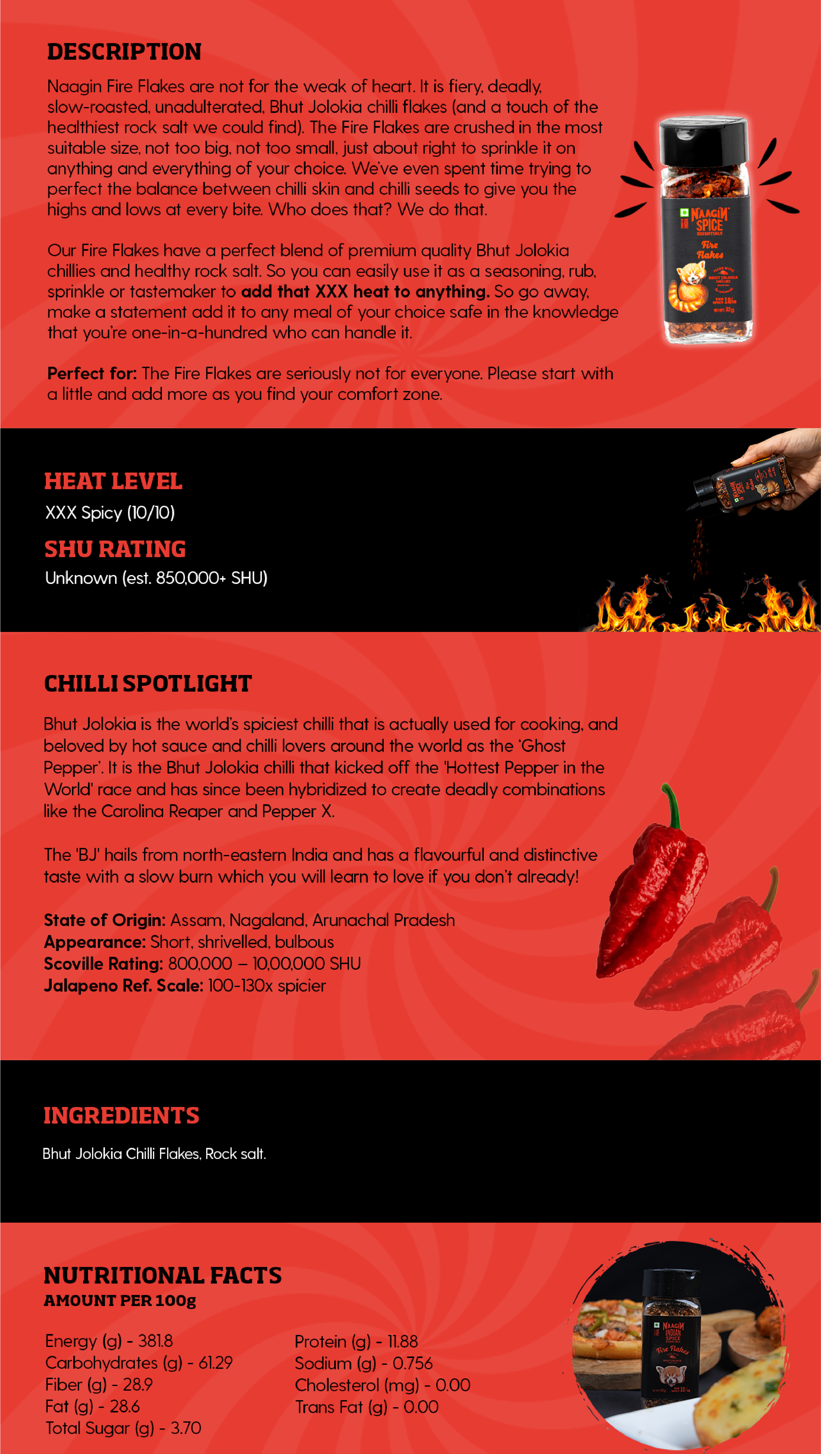 We know our chillies and given how much people have loved our Smoky Bhoot hot sauce (and asked us why it’s not spicy enough), we felt obliged to just give these fine folks what they really want but didn't say - edible fire. Our Fire Flakes will blow your mind the second they touch your tongue! You've been warned.