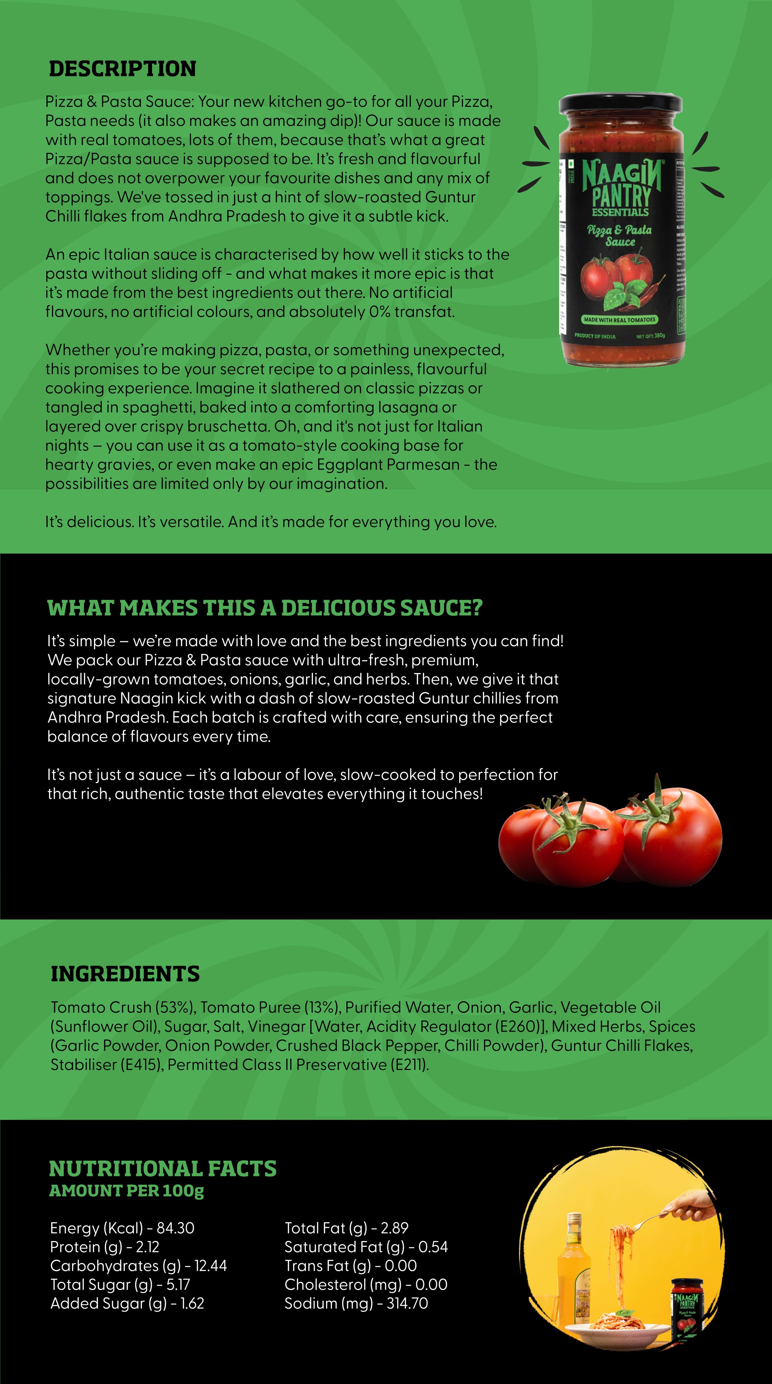 Our Pizza & Pasta Sauce is perfectly salted, and its sweet-to-tart ratio and exceptional flavour comes from a natural harmony of the highest quality of premium, locally grown tomatoes, onion, garlic, mixed herbs and a dash of slow roasted Guntur chilli flakes.